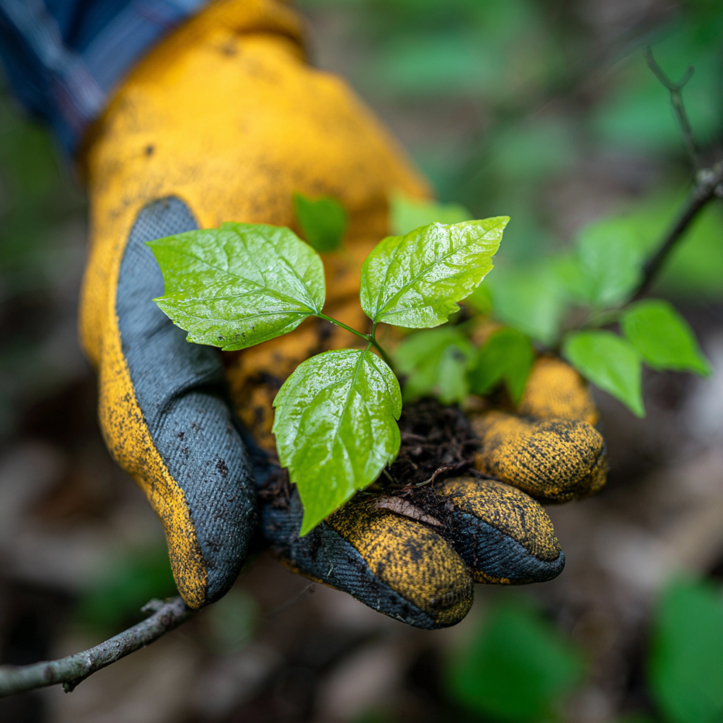 However, all the herbicides which kill poison-ivy may also kill or damage other plants growing nearby. If poison-ivy is growing among perennial ornamentals, in a hedge, or entwined about a favorite tree, one must resort to cutting and digging to destroy it. Wear gloves and other protection while cutting and grubbing. Take care also to prevent other persons from being inadvertently contaminated by the tools, the roots, stems and leaves, or by the smoke if the material is burned (see section on Harmful Effects).