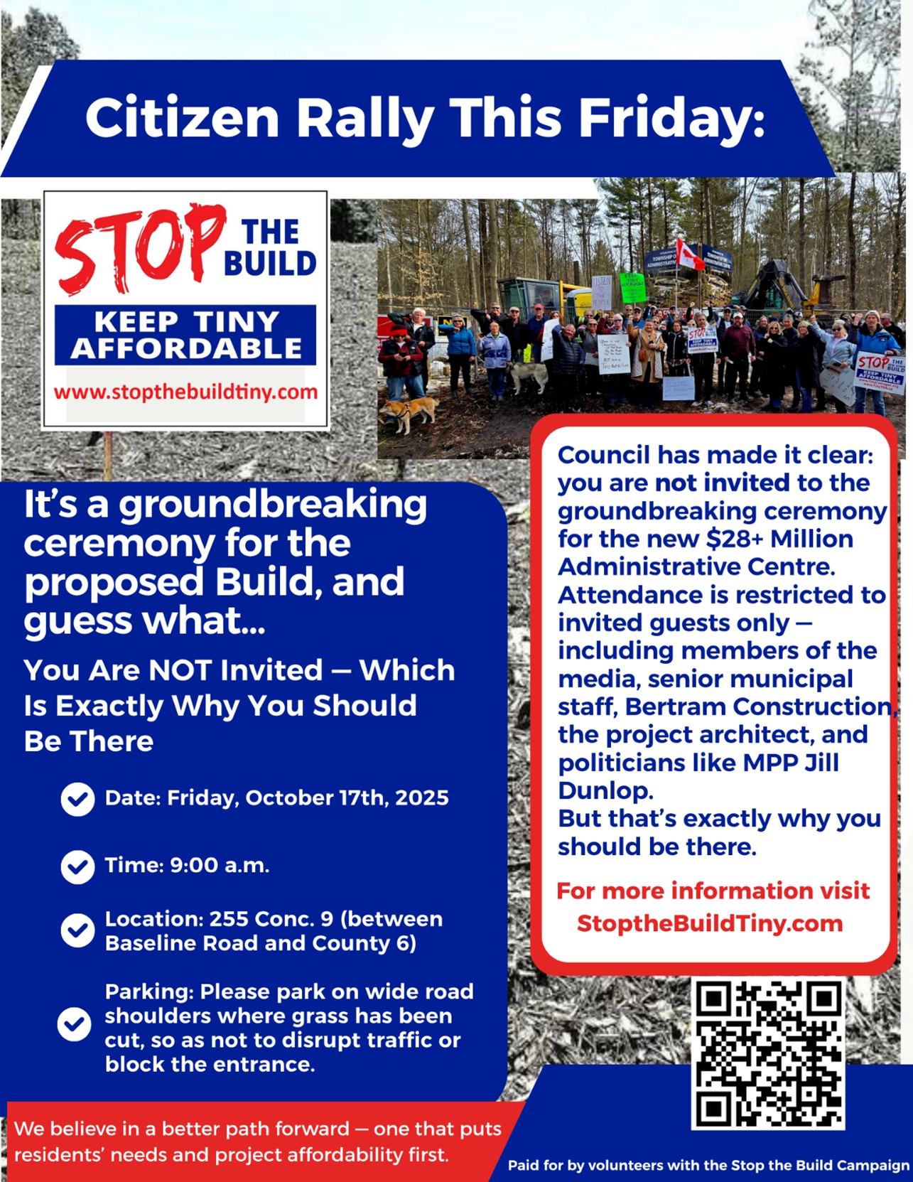 A Message From the Tiny Township Residents Alliance Dear friends and neighbours, ______ While this is not a LASHA sponsored event, we do believe the New Municipal building will have a significant impact on taxes going forward in the LASHA community and the current Council and our local MP, Jill Dunlop, needs to hear our opposing voice! Strength in Numbers! Dear friends and neighbours, The Township of Tiny has announced a Groundbreaking Ceremony for the new Administrative Building — but in keeping with the tone of this entire project, the public is not invited. Attendance is restricted to a select list of insiders: members of the media, senior municipal staff, Bertrand Construction, the project architect, and local politicians, including MPP Jill Dunlop. This exclusion speaks volumes. The people paying for this project — the residents of Tiny — are being left outside the fence while a handful of officials and contractors celebrate